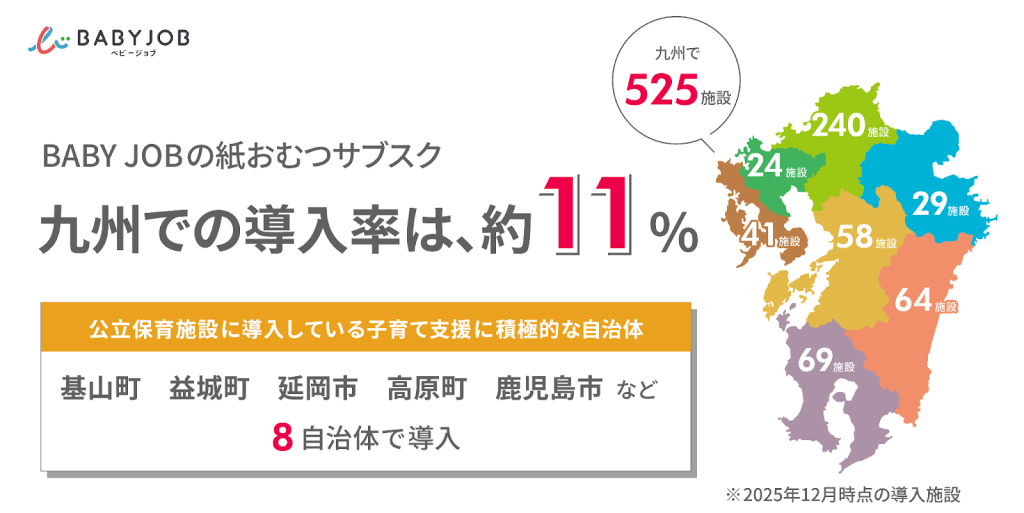 九州におけるBABY JOBの紙おむつ・おしりふきサブスクの導入は、現在525施設(11.0%※2)にとどまっており、自治体との連携も8自治体に限られています。