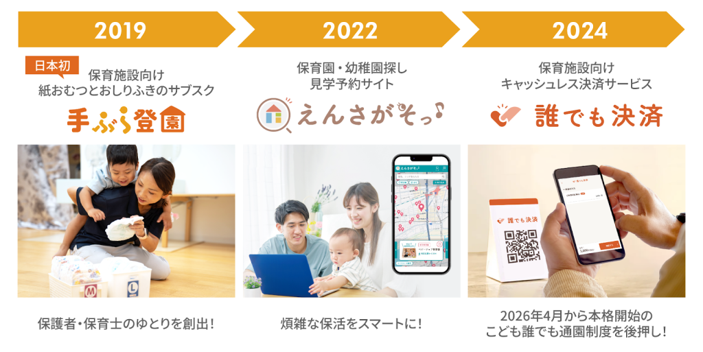 BABY JOB株式会社は、「すべての人が子育てを楽しいと思える社会」の実現をビジョンに掲げ、少子化や子育てを取り巻く課題の解決に取り組んでいます。その取り組みの一環として、保護者や保育現場の負担軽減を目的に、これまで以下のようなサービスを展開してきました。
