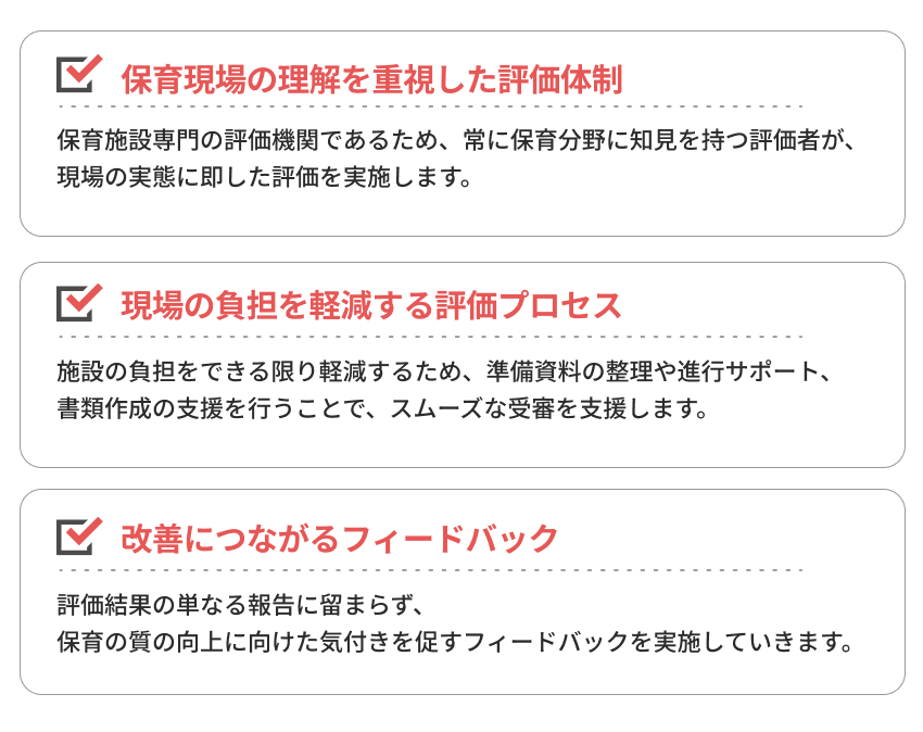 これらの特徴により、保育施設が「受けてよかった」と感じられる第三者評価を目指しています。